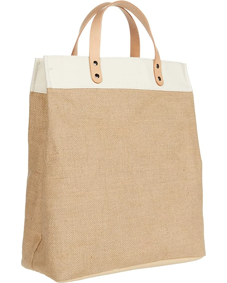 - Playful planet-friendly, reusable tote with dual leather handles.