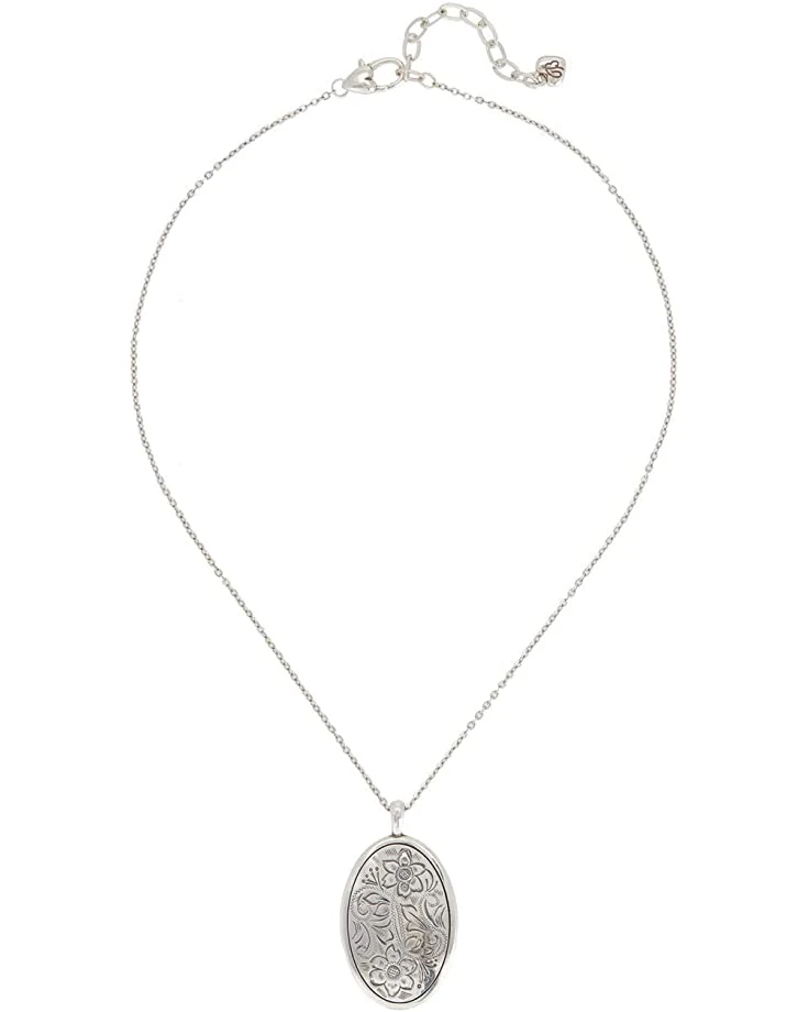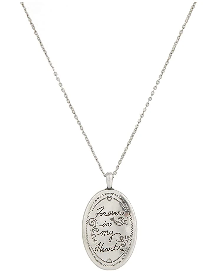 - This Brighton necklace is crafted in a silver-tone plated metal with an oval pendant engraved with “Forever in my heart” on one side and floral motif on the other.
