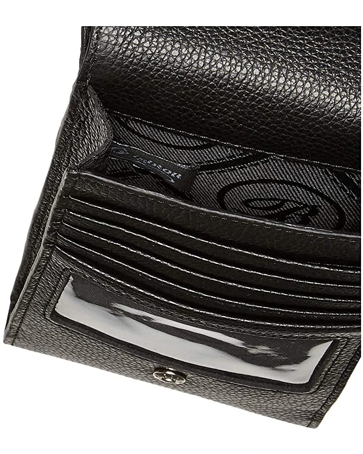 - Snap closure with exterior slip pocket and five credit card slots and ID window under flap.