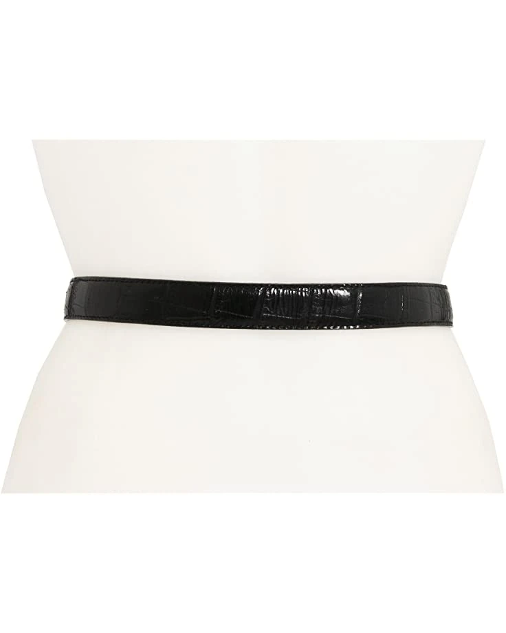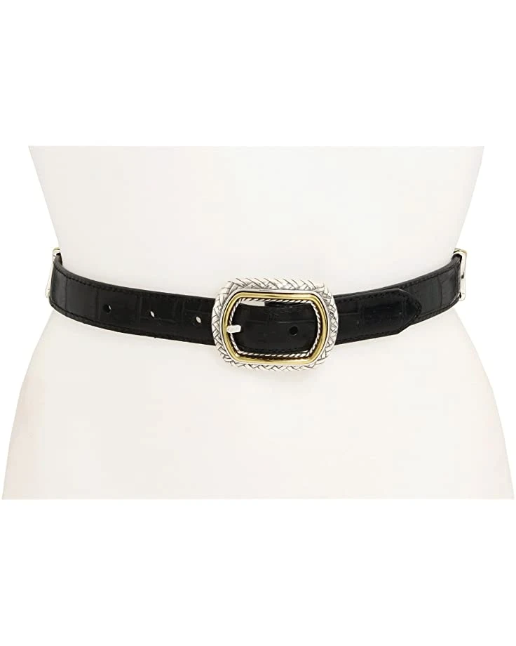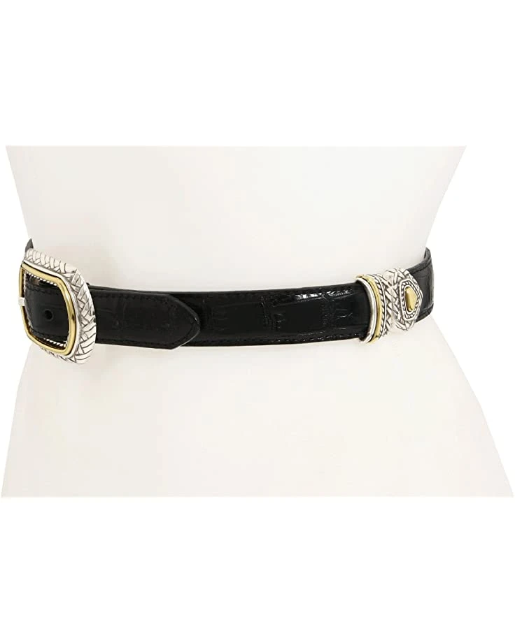 - Polished gold-tone and silver-tone pivoting buckle and hardware accent.