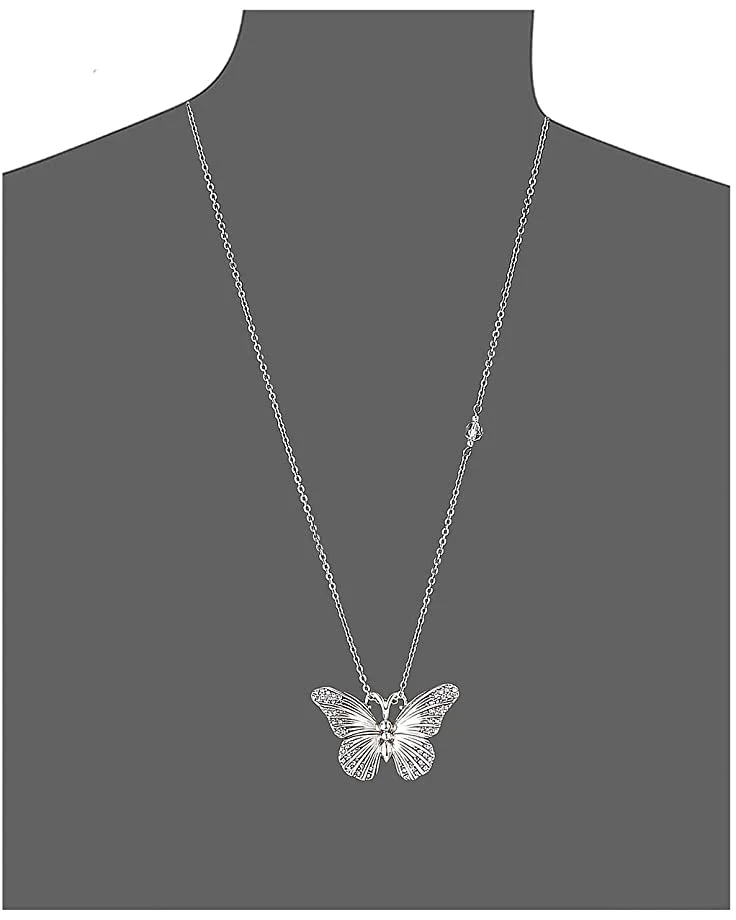 - Adorned with Swarovski crystals, this butterfly’s wings shimmer in the sunshine. On a long chain, it makes a delicate statement.